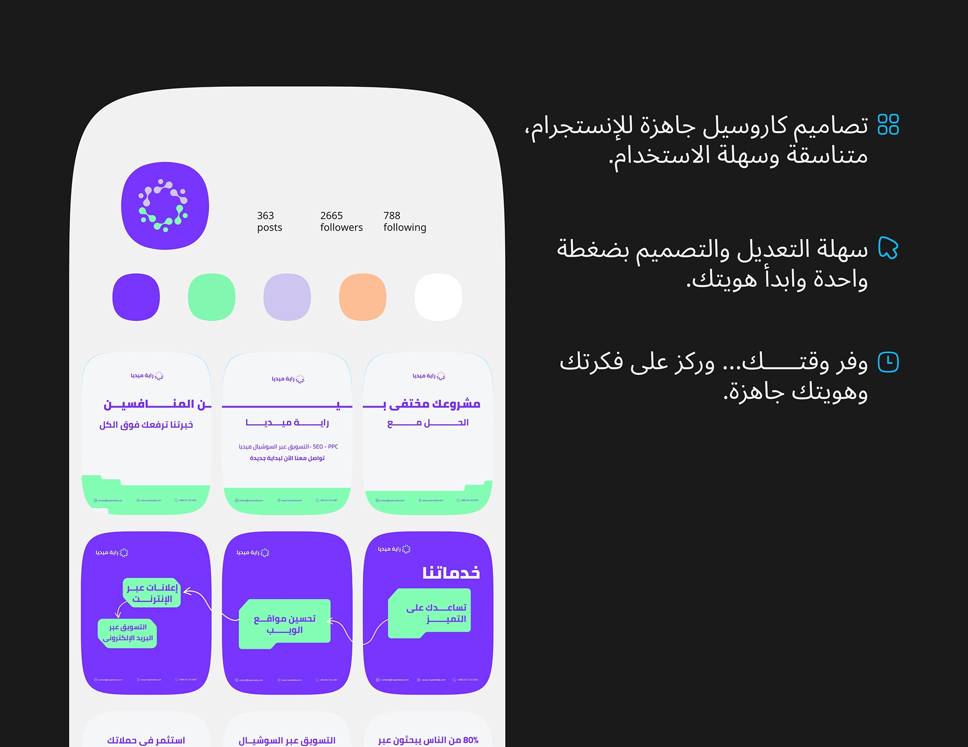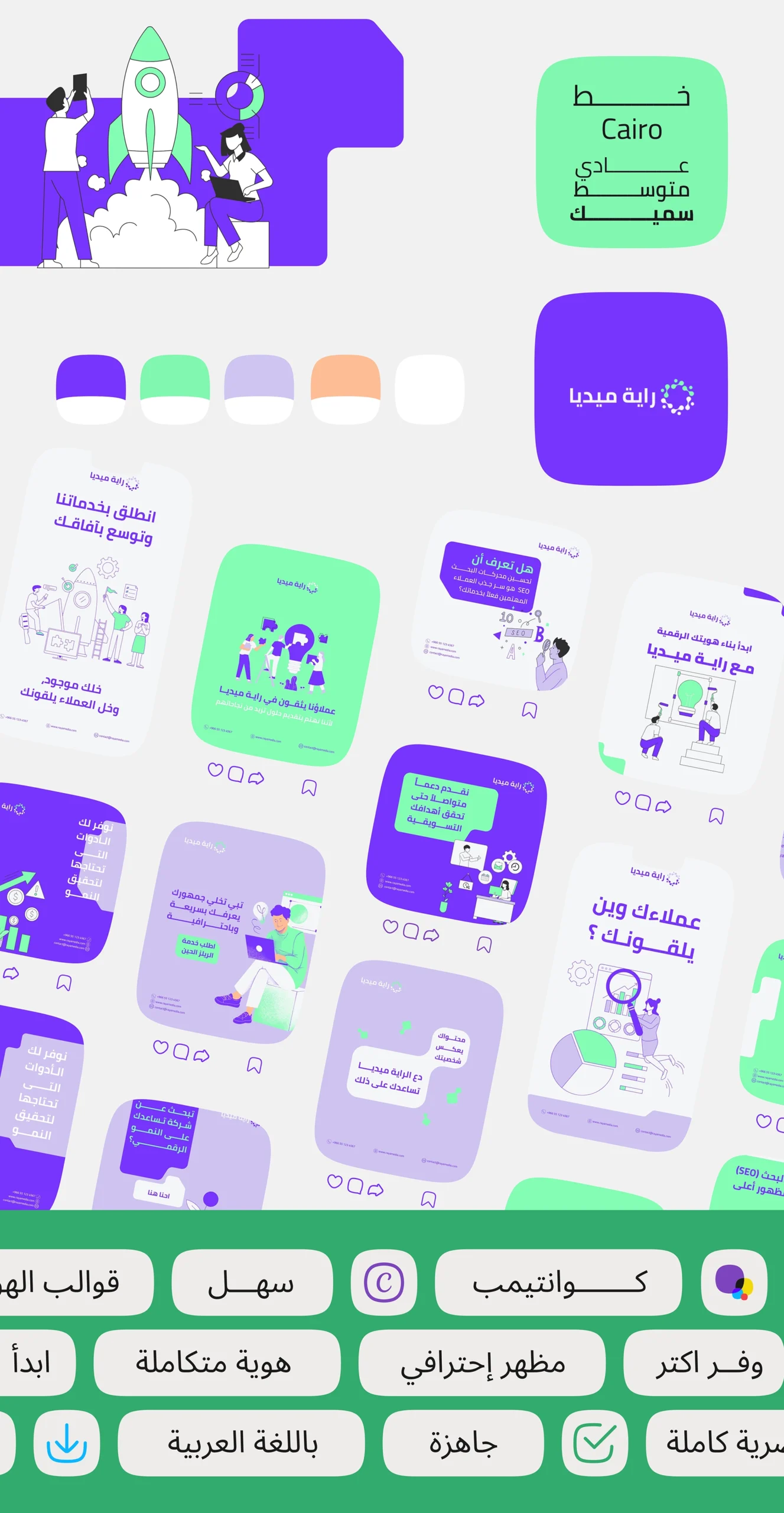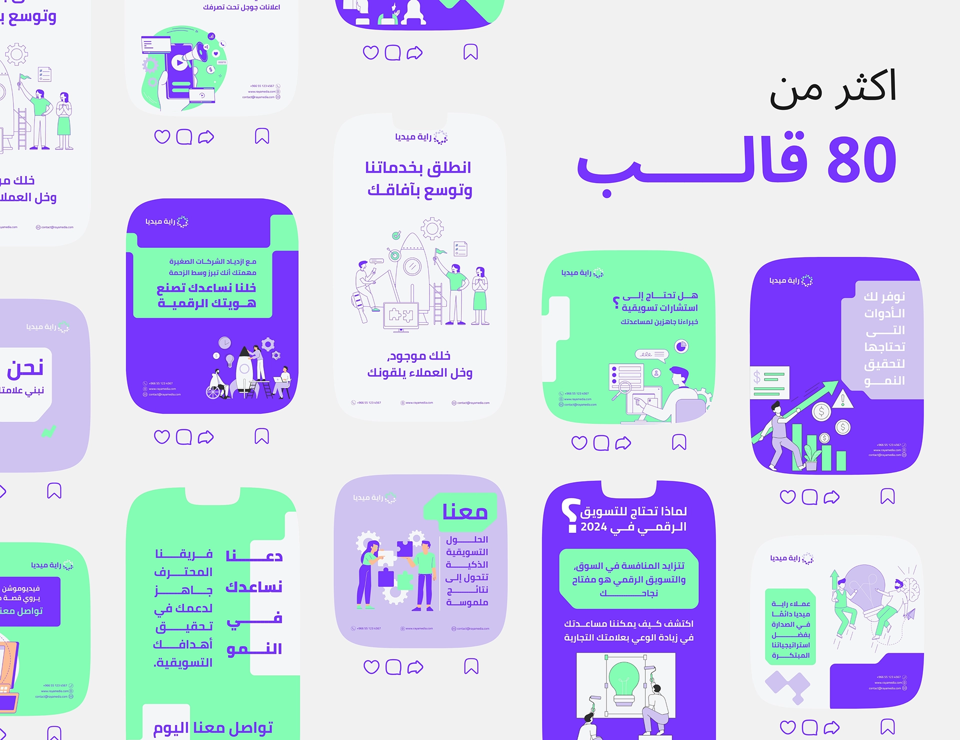 حزمة تضم أكثر من 75 قالب سوشيال ميديا احترافي مخصّص لشركات التسويق الإلكتروني والمسوقين المستقلين (فريلانسرز)، مصممة علشان تنشئ محتوى قوي ومتناسق للمنشورات، القصص، والفيديوهات القصيرة بدون مصمم أو وقت ضايع.