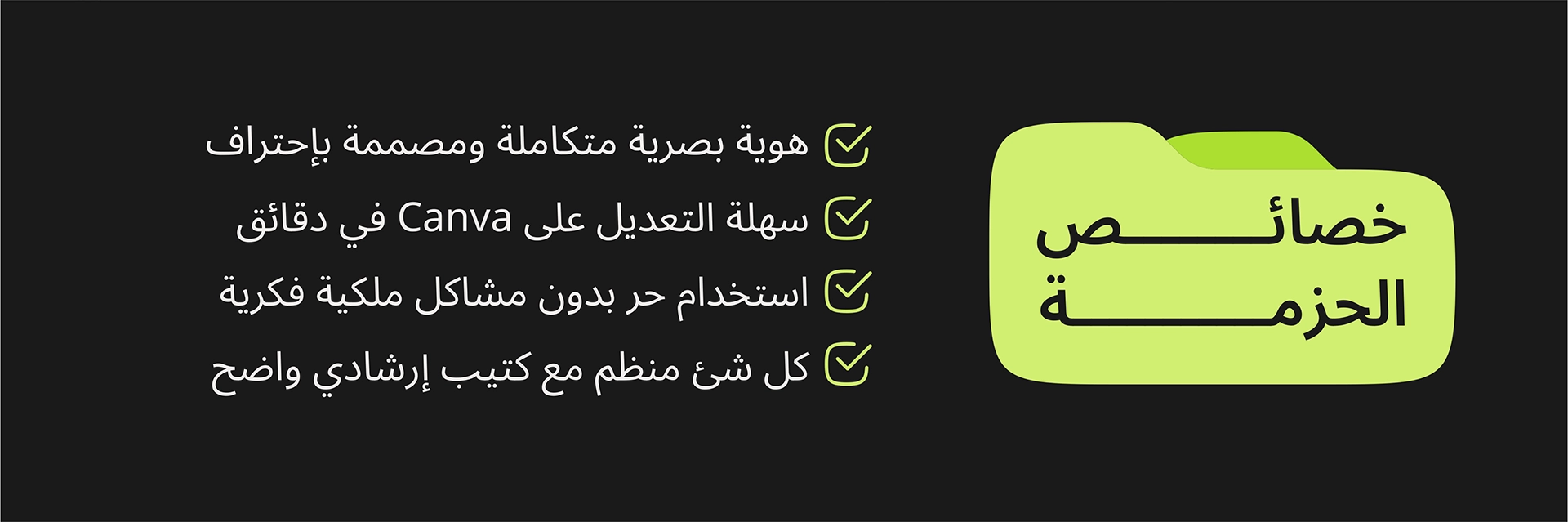 تشمل الحزمة قوالب للمنشورات، القصص (Stories)، والفيديوهات القصيرة (Reels)—all قابلة للتعديل بسهولة على Canva.