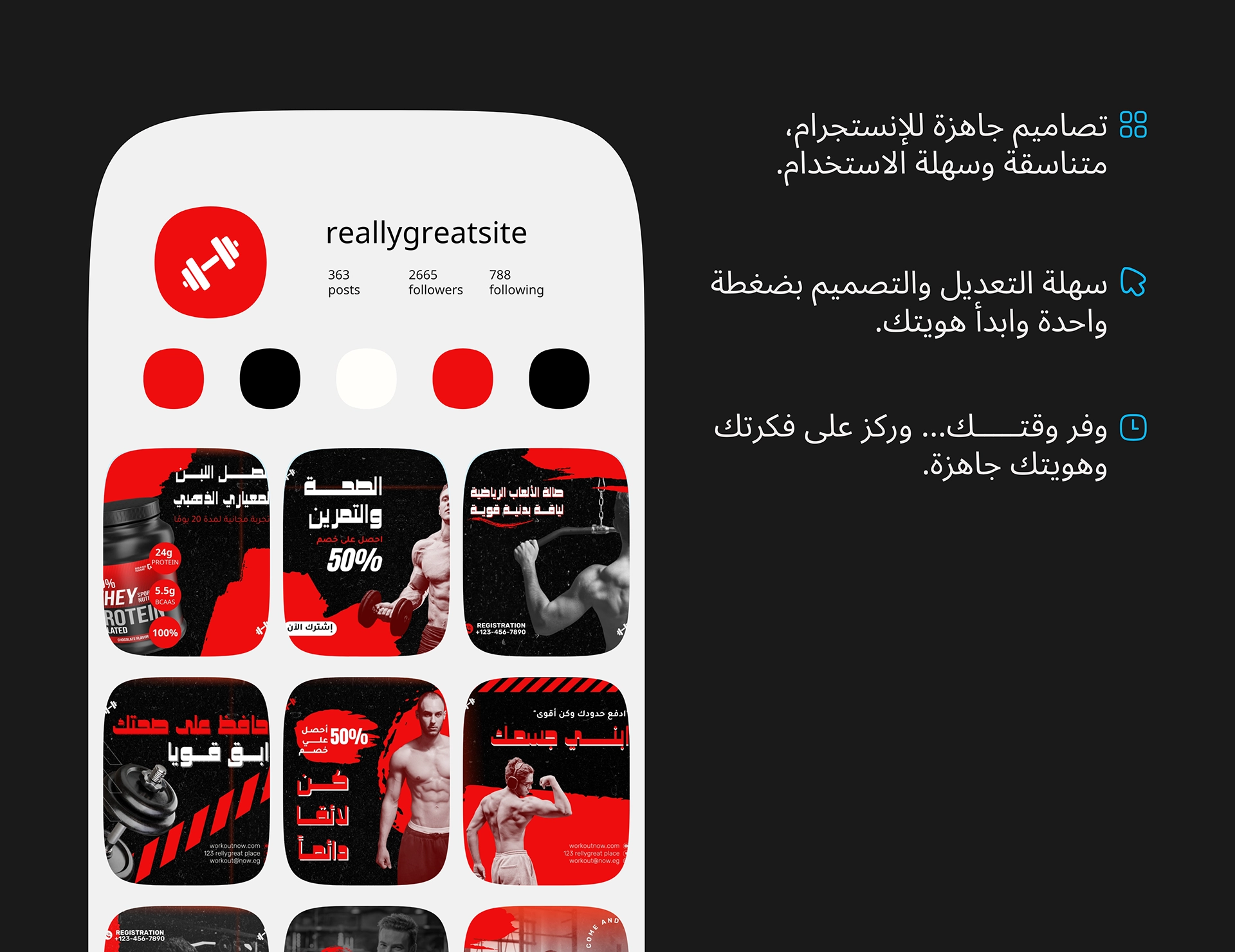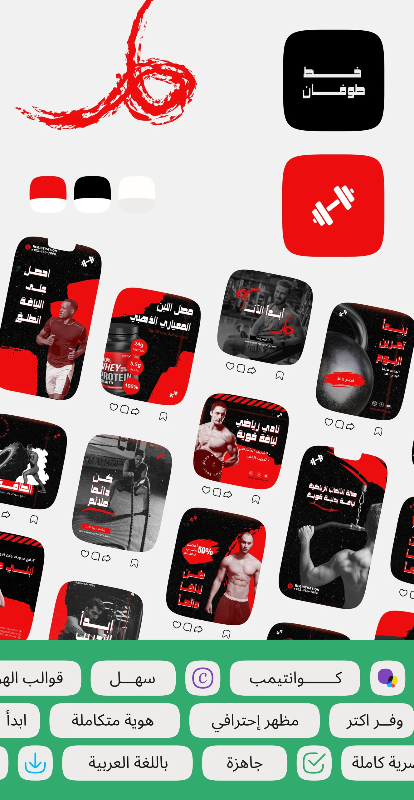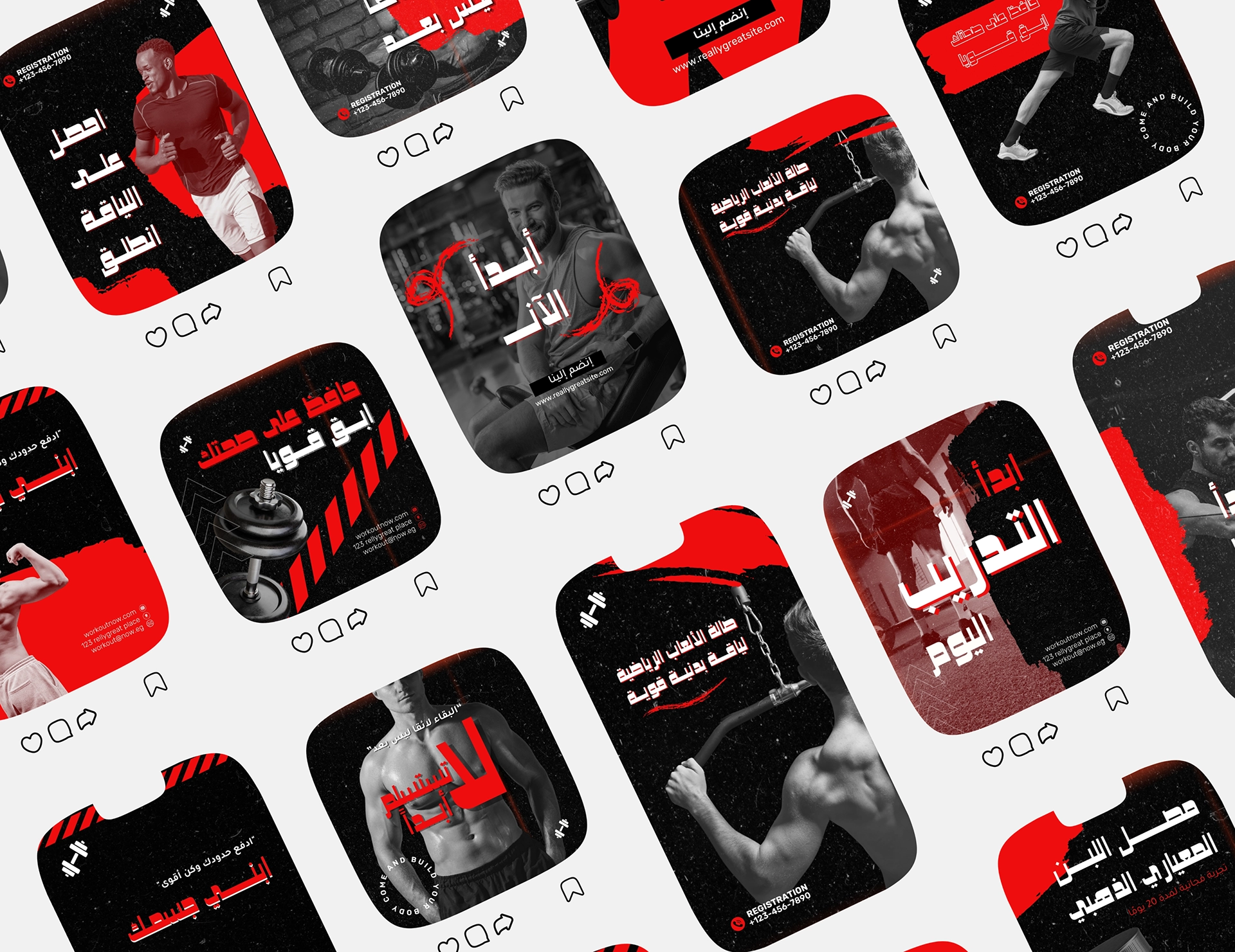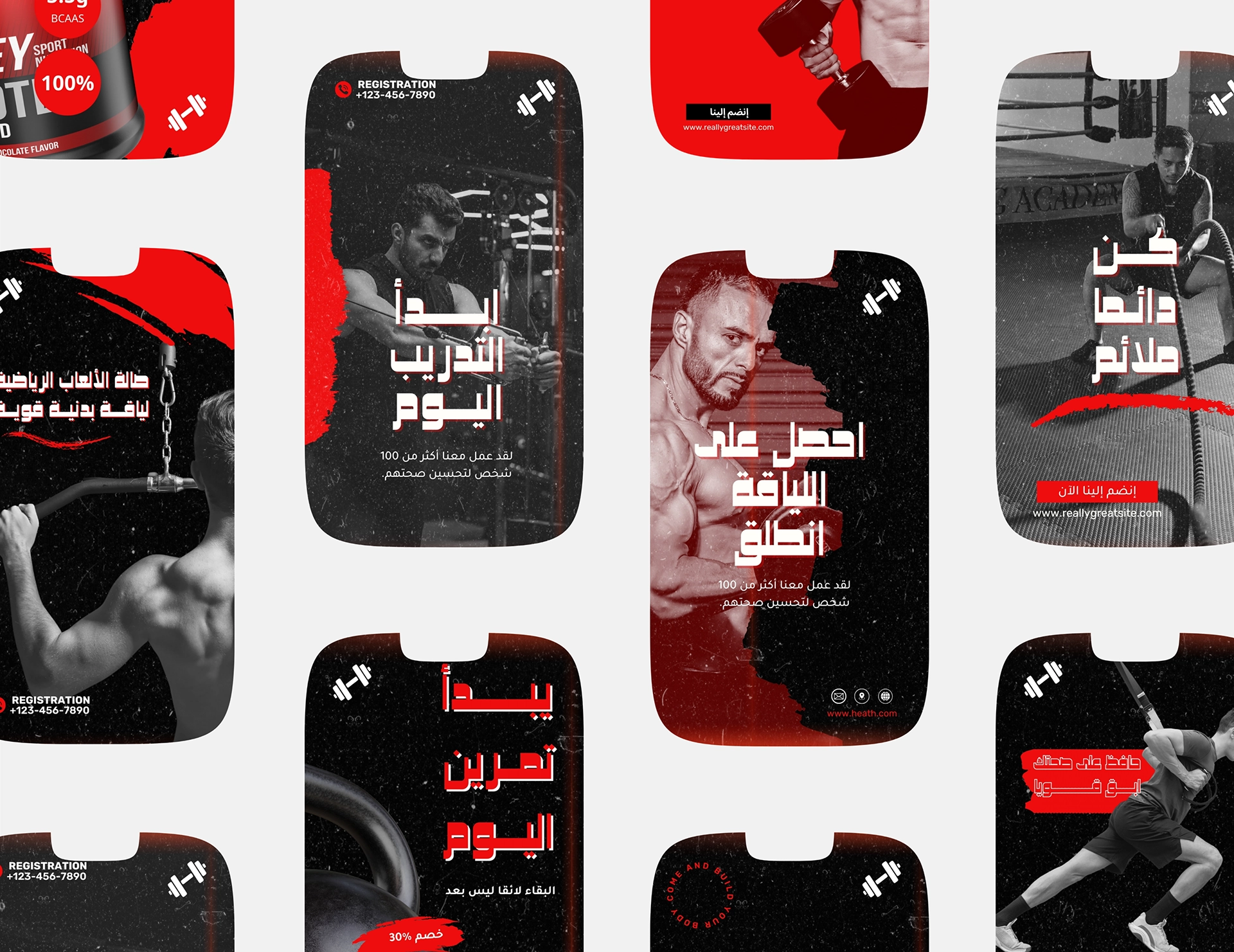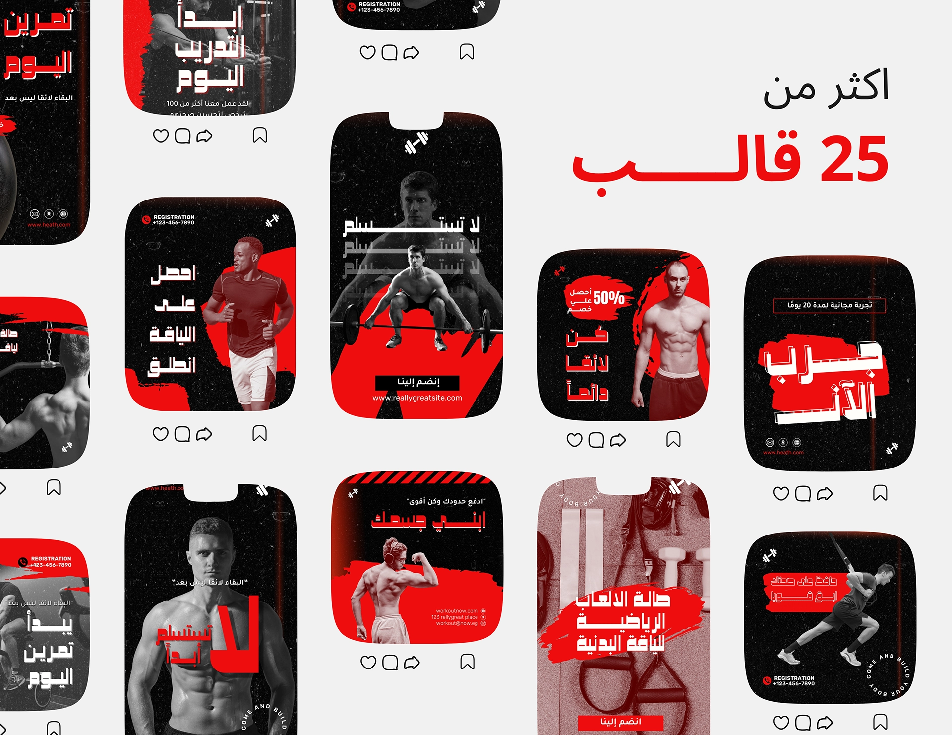 حزمة قوالب سوشيال ميديا جاهزة مخصّصة لصالات الجيم، الالعاب الرياضية، وأندية اللياقة البدنية، تساعدك تعرض برامج التدريب، النصائح الرياضية، العروض، ونتائج العملاء بطريقة جذابة واحترافية بدون مصمم أو وقت ضايع.