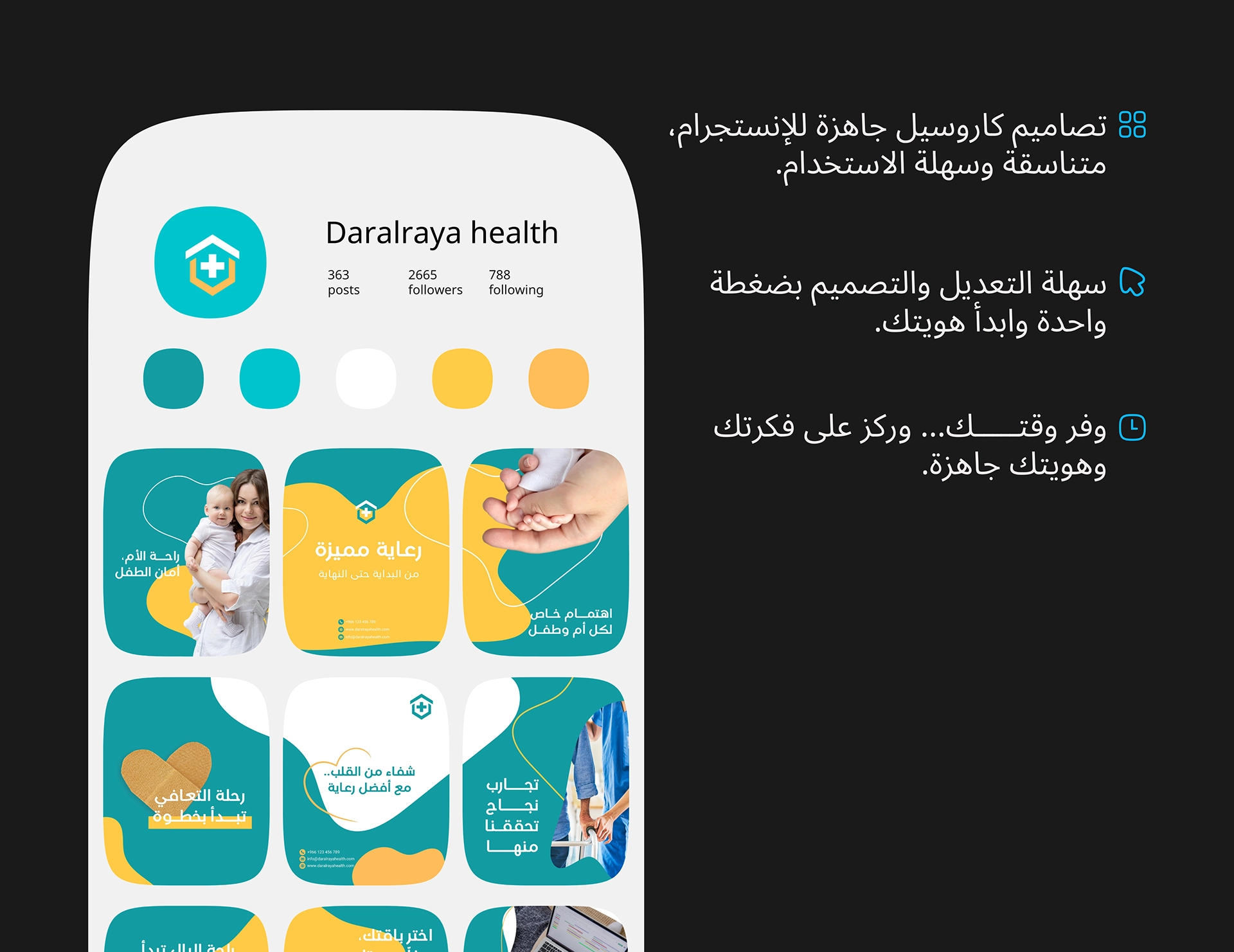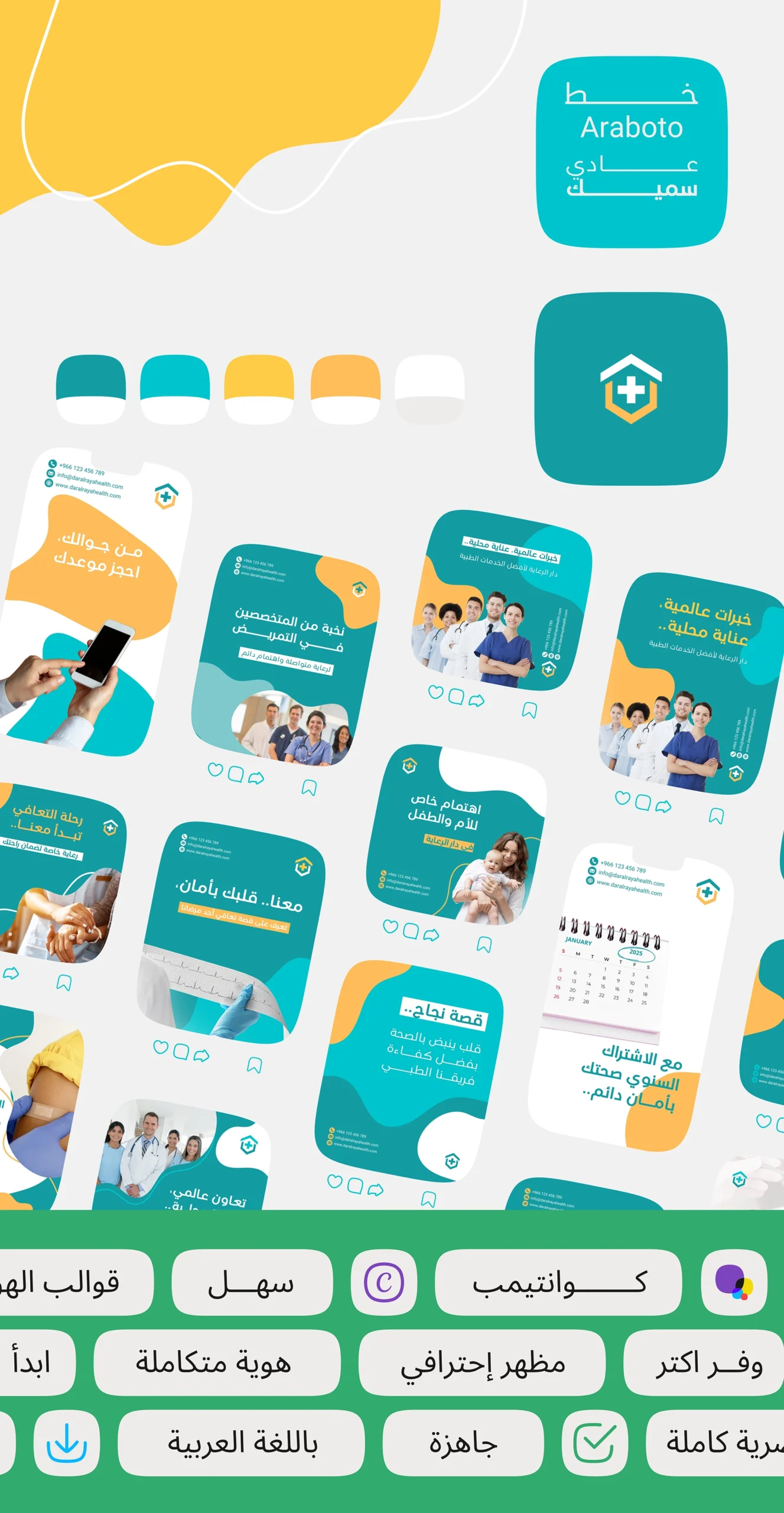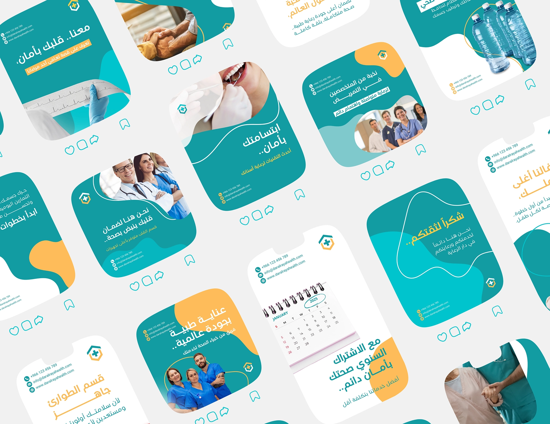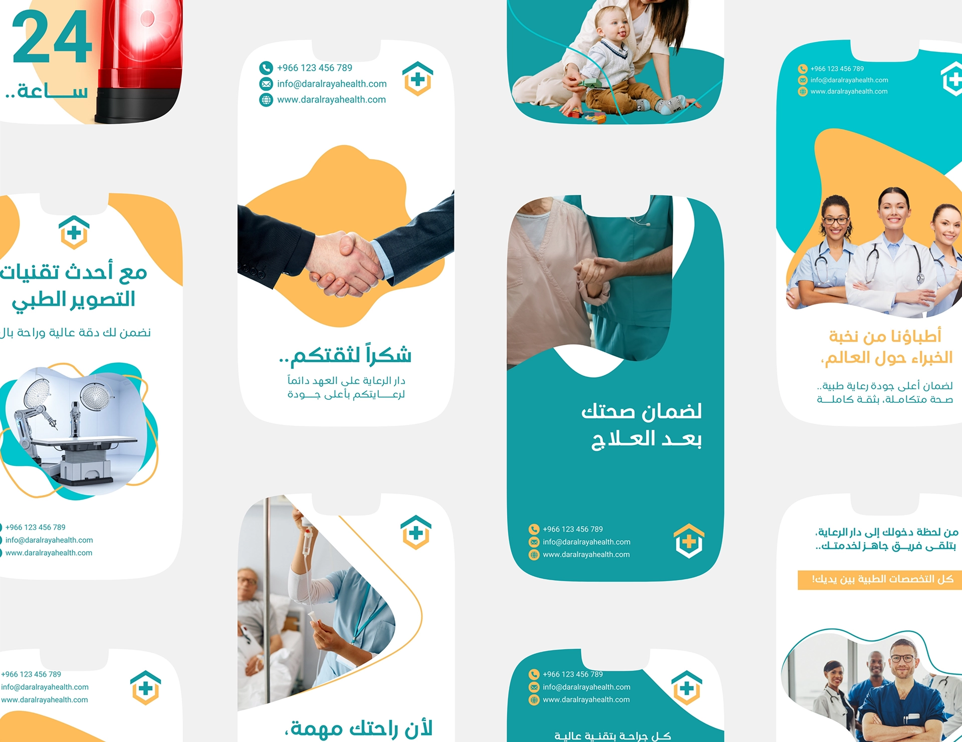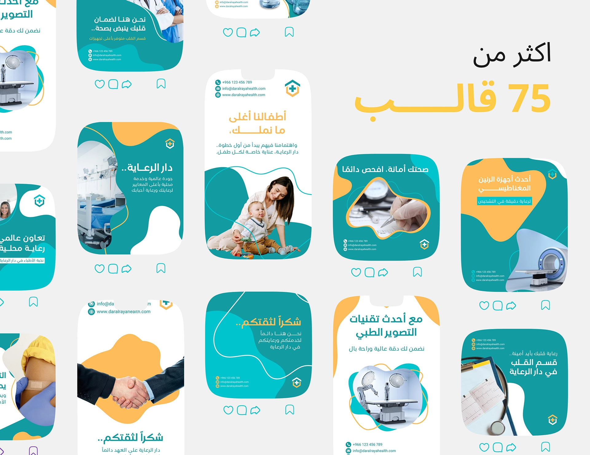 حزمة قوالب سوشيال ميديا جاهزة للرعاية الطبية والمستشفيات، مصممة علشان تساعد المستشفيات، العيادات، والكوادر الطبية في عرض الخدمات، النصائح الصحية، التعريف بالأطباء، والمحتوى التثقيفي بشكل جذاب واحترافي بدون مصمم أو وقت ضايع.