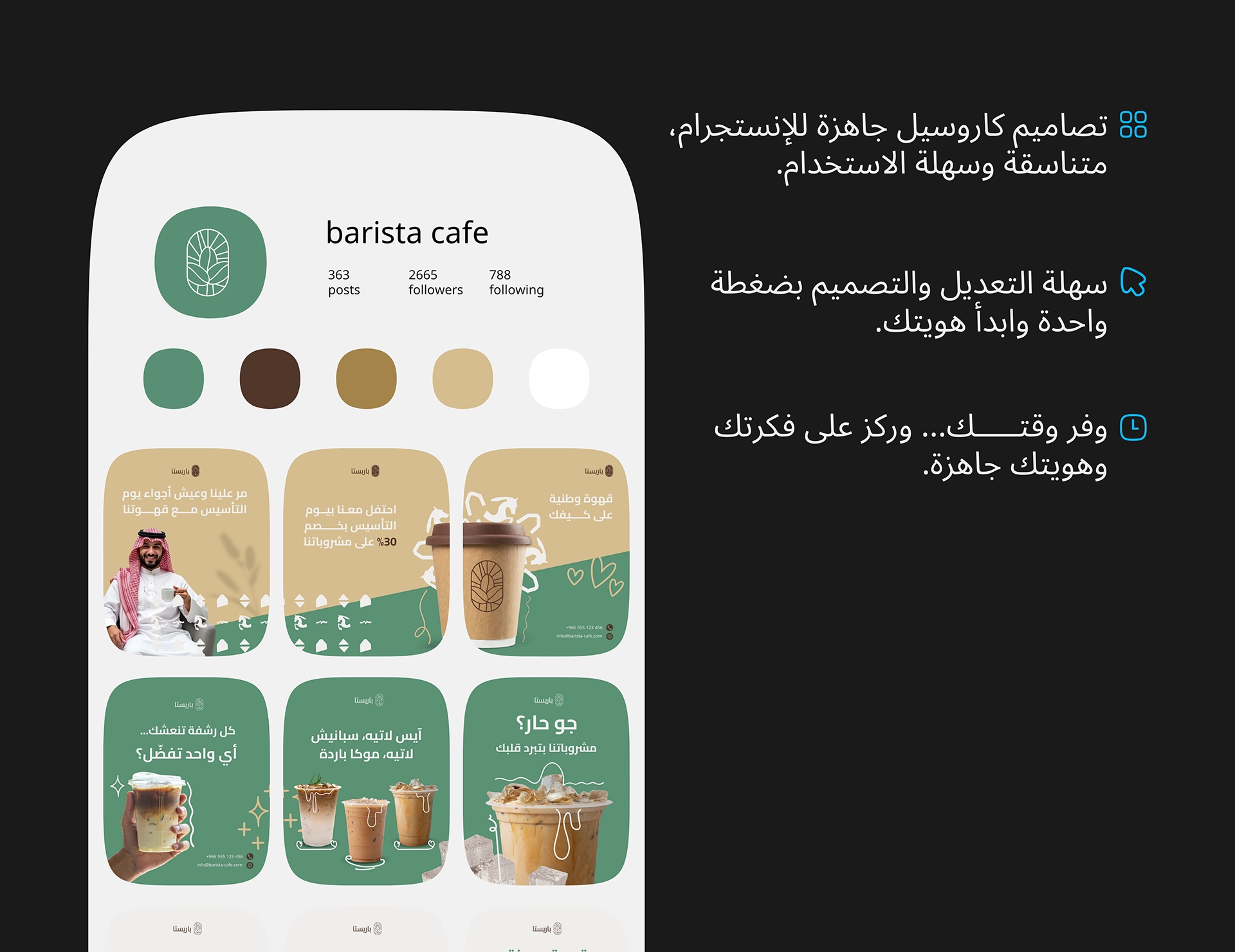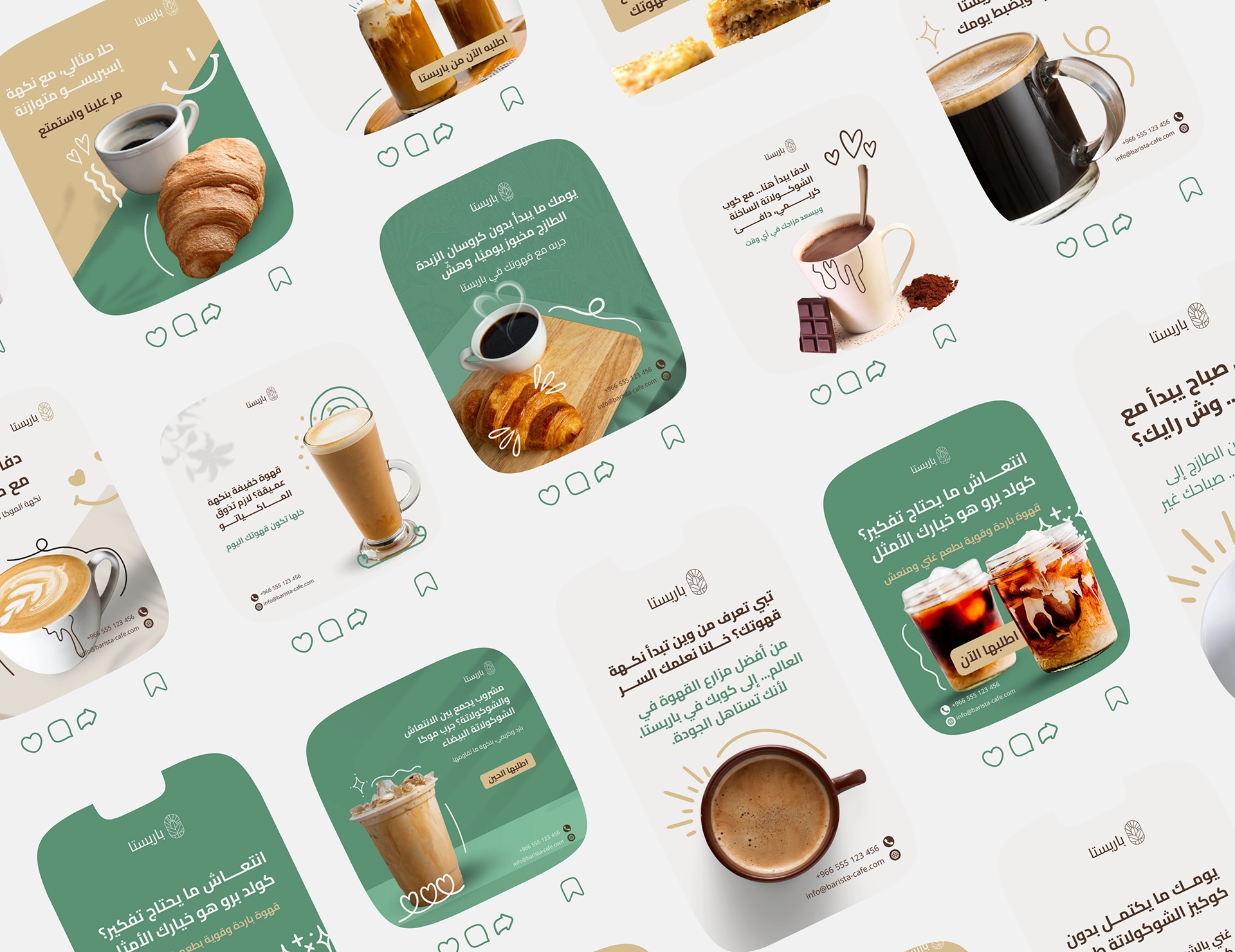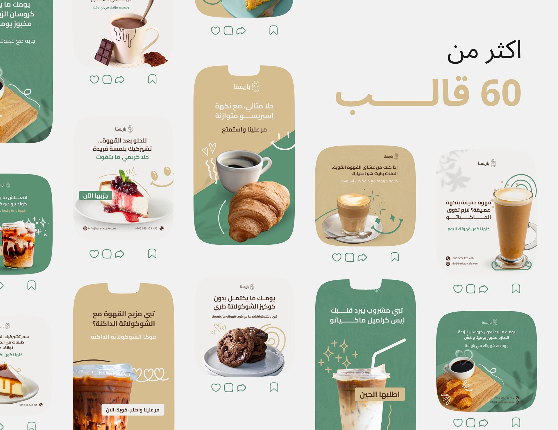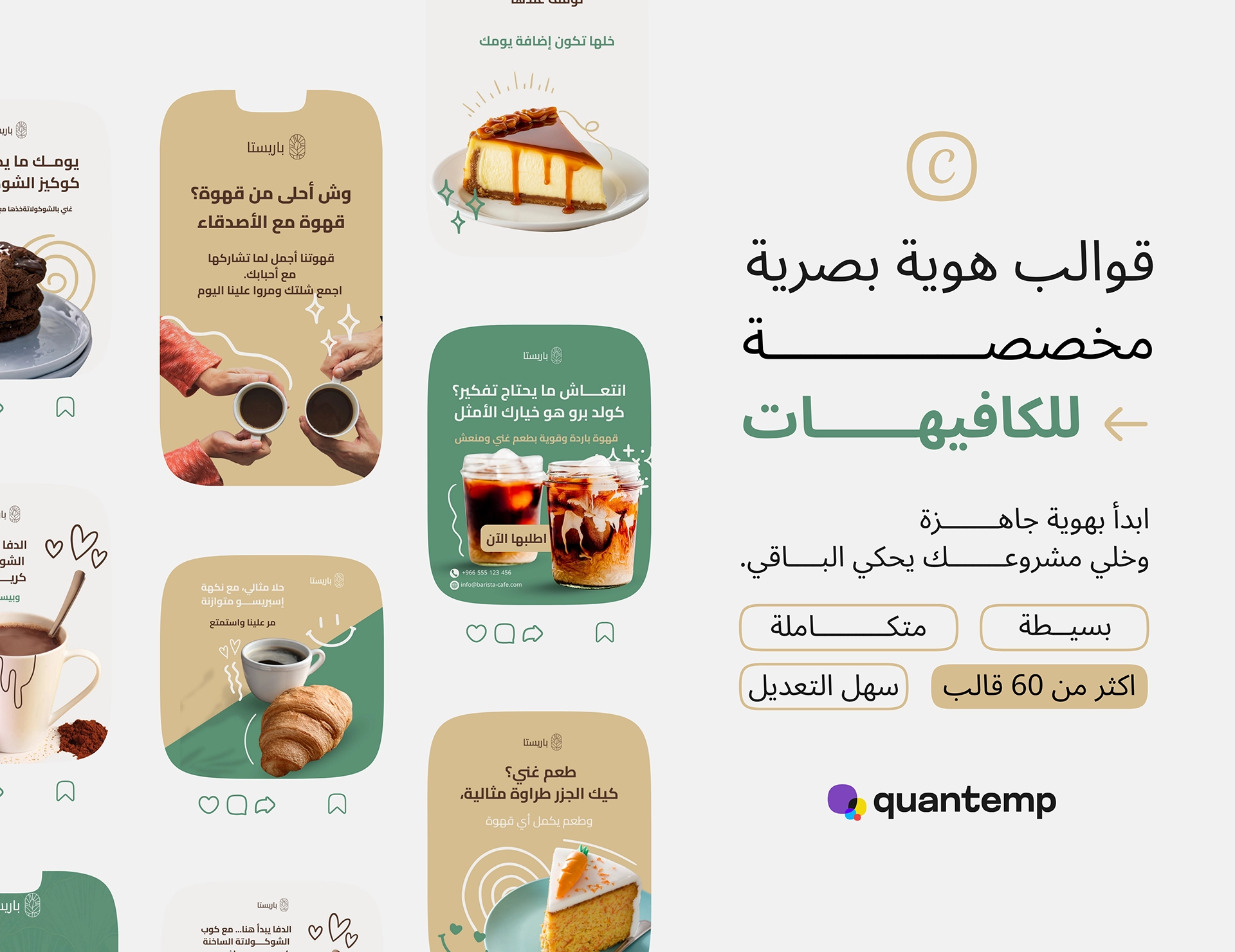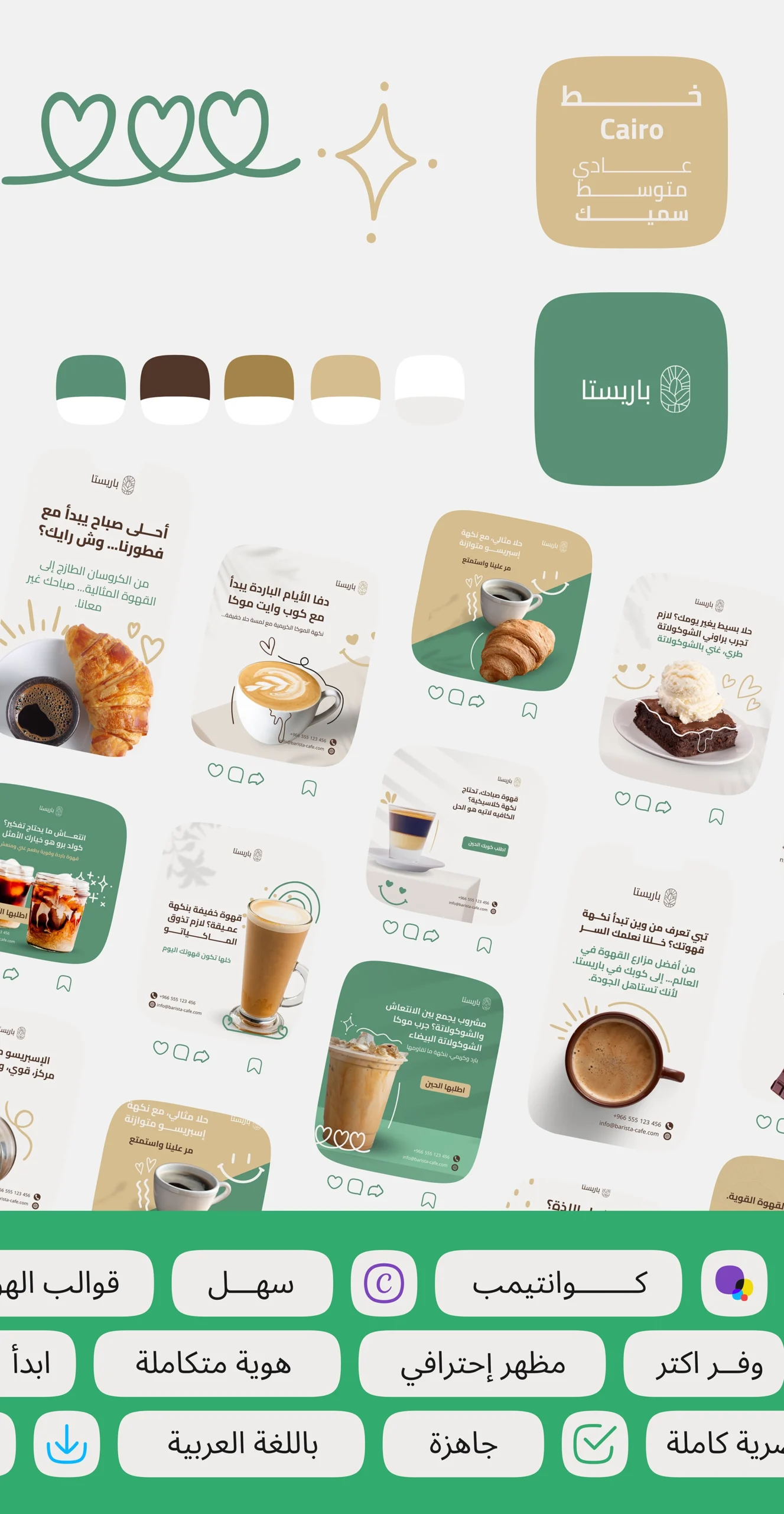 حزمة قوالب سوشيال ميديا جاهزة للكافيهات والمقاهي، مصممة علشان تعرض القهوة والمشروبات والحلويات بشكل جذاب ومتناسق، وتساعدك تنشر محتوى احترافي من غير مصمم ولا وقت ضايع.