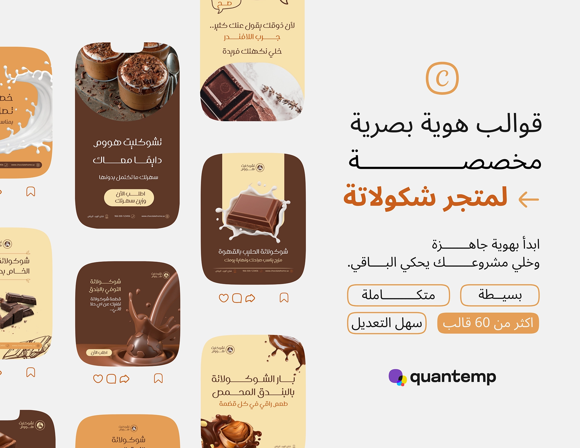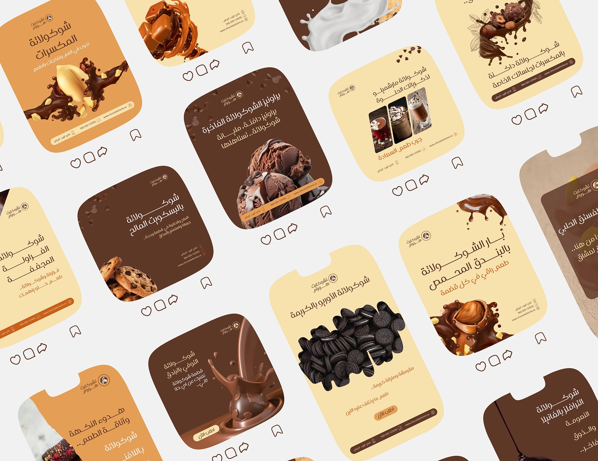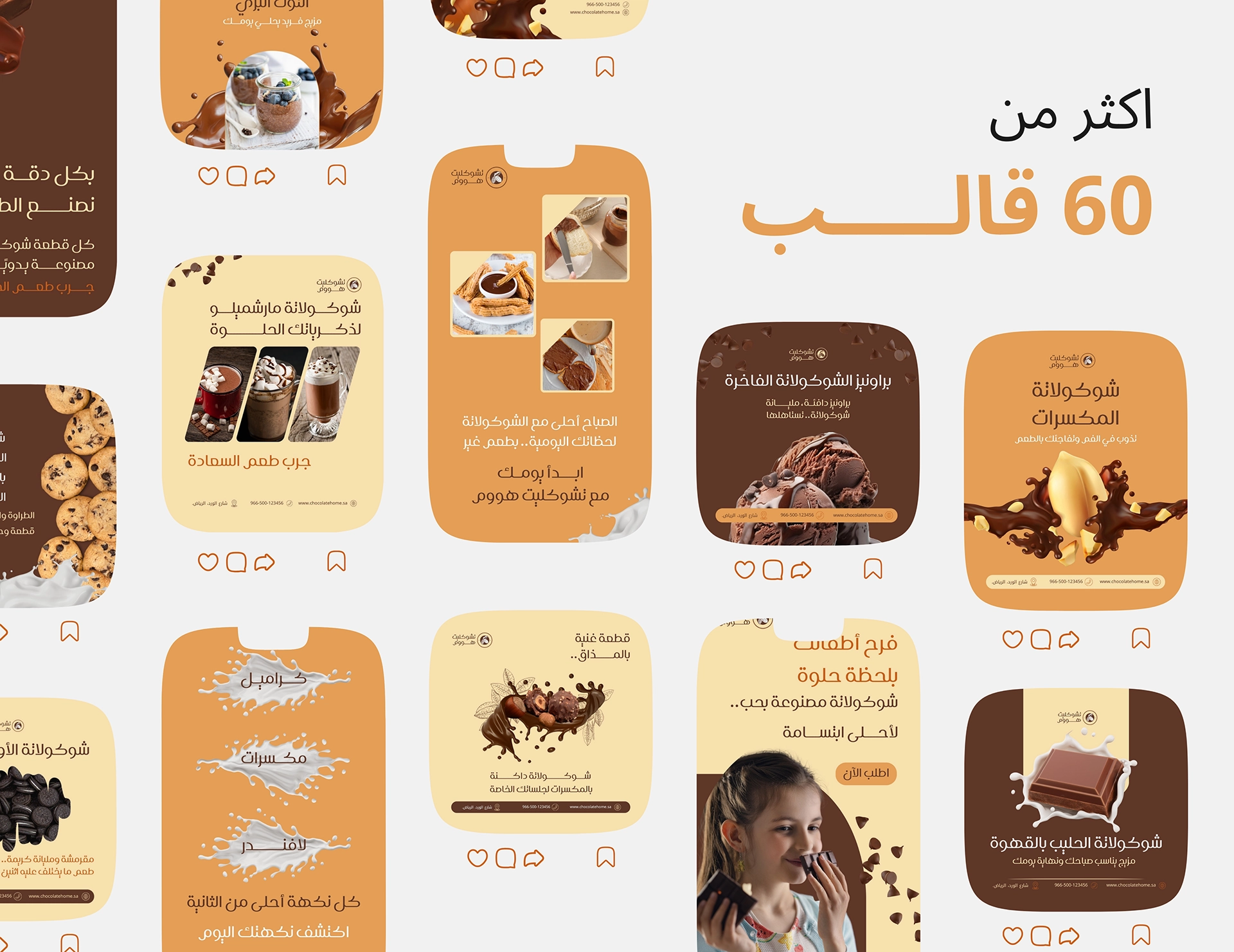 حزمة تصميمات جاهزة للسوشيال ميديا، معمولة مخصوص لمتاجر الحلويات وبيع الشوكولاتة، تساعدك تنشر محتوى ثابت واحترافي من غير مصمم ولا وقت ضايع.