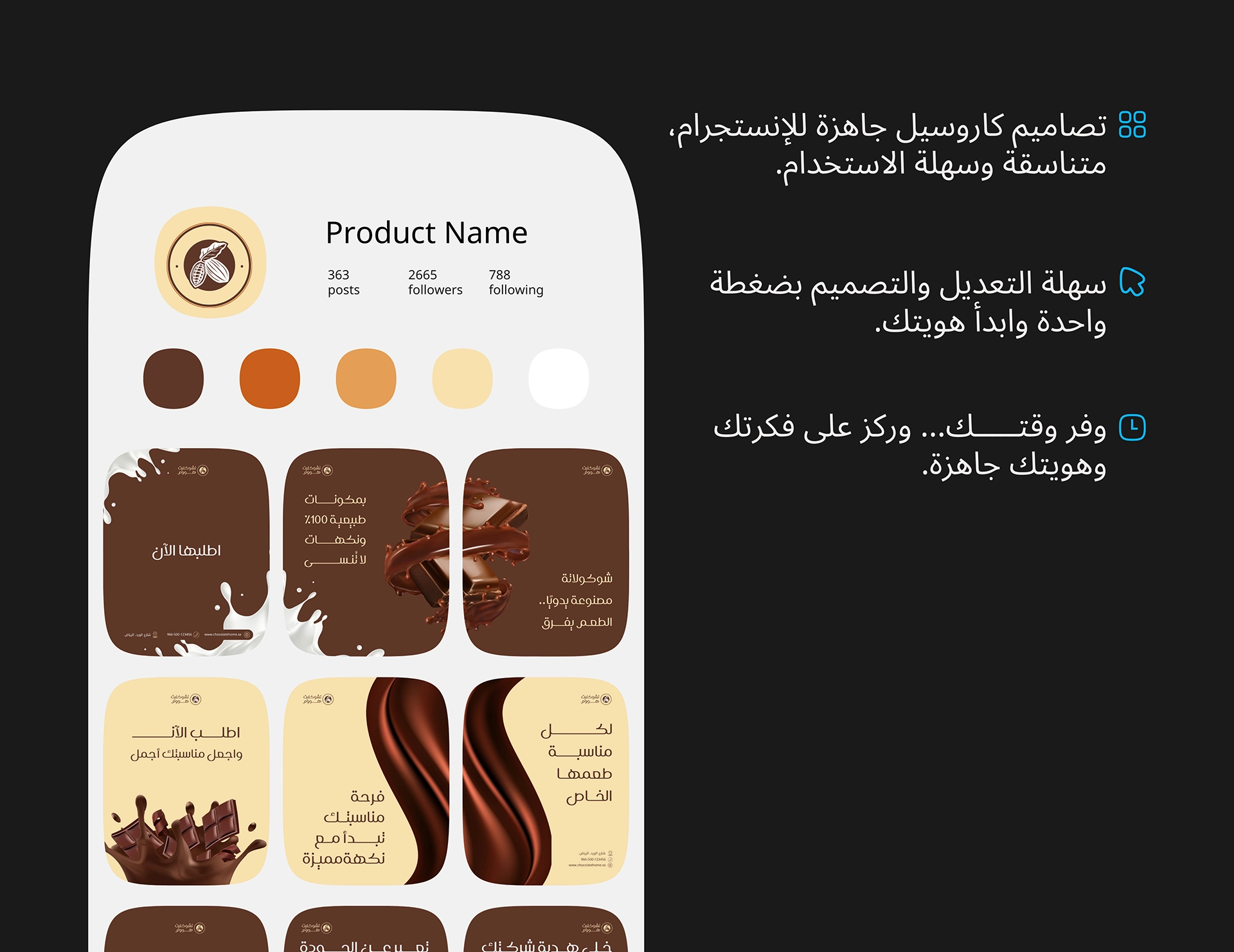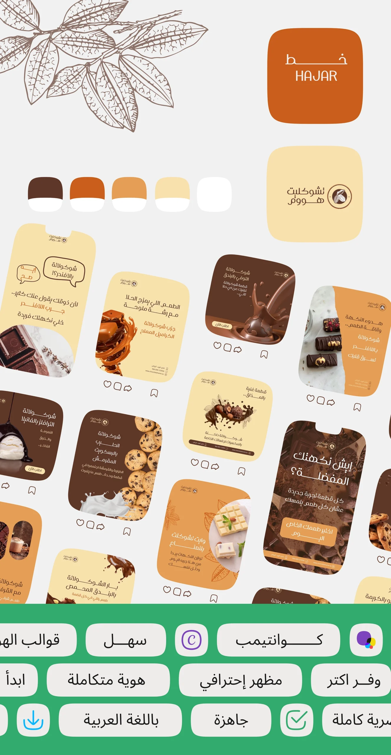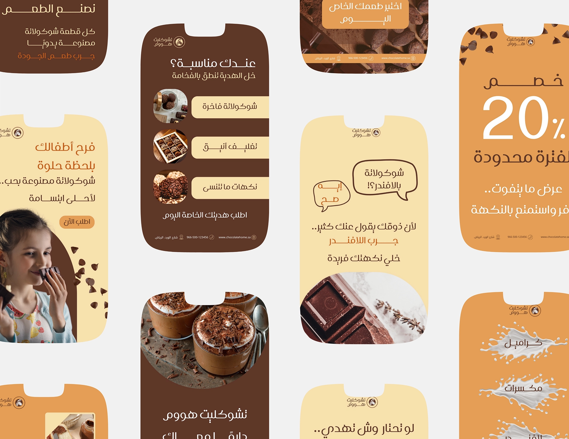 حزمة تصميمات جاهزة للسوشيال ميديا، معمولة مخصوص لمتاجر الحلويات وبيع الشوكولاتة، تساعدك تنشر محتوى ثابت واحترافي من غير مصمم ولا وقت ضايع.